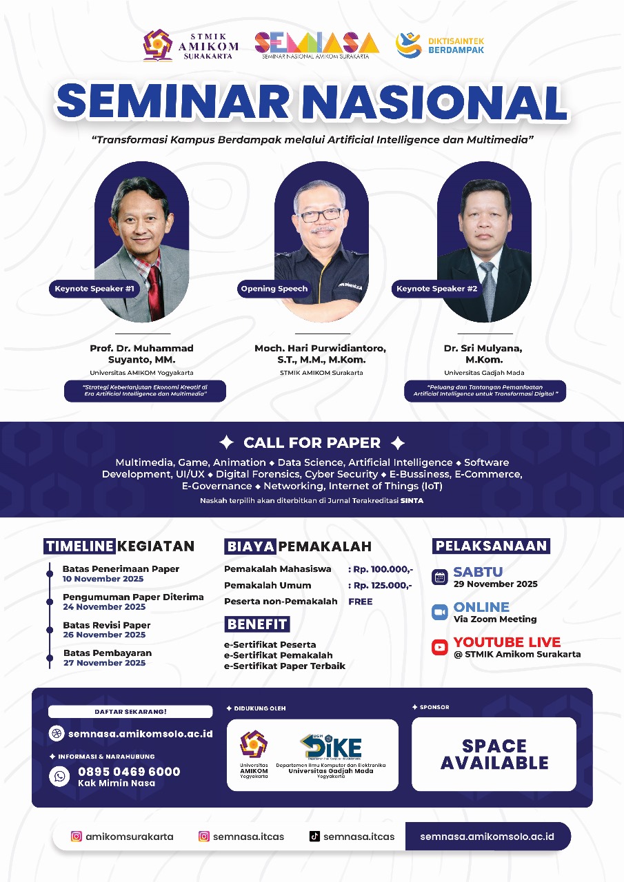 Prosiding SEMNASA merupakan media publikasi Seminar Nasional yang diselenggarakan oleh STMIK AMIKOM Surakarta setiap tahun. Prosiding SEMNASA mendisemimasi atau menyebarluaskan hasil penelitian, pemikiran atau gagasan dari para peneliti maupun akademisi se-Indonesia.